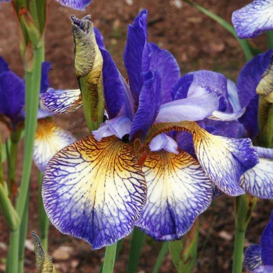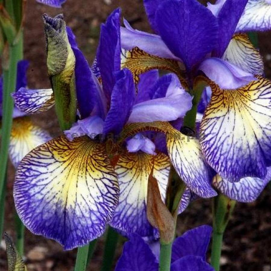 Высота взрослого растения 100 см. Срок цветения ранний. Великолепные сине-фиолетовые цветы, крупные сигналы сливочно-золотистого цвета. Фолы в темно-фиолетовых и белых прожилках; сине-фиолетовые стандарты.