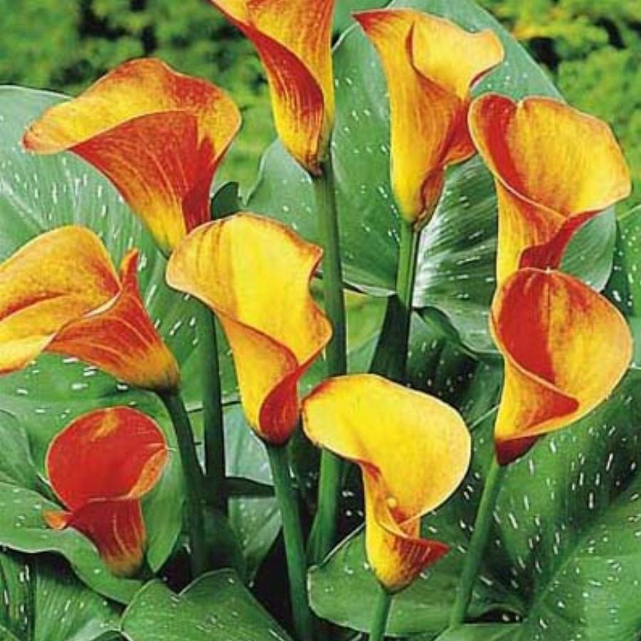 Один из лучших, обильно цветущих сортов калл, предназначенных для украшения сада и срезки. Его оранжево-жёлтые цветки постепенно покрываются кораллово-красными пятнами. Яркая необычная окраска и строгая, классическая форма покрывала цветка этого сорта дополняются серебристым рисунком на зелёных листьях.Красно-желтая, крупная, высота 55 см, цветение июль-август.