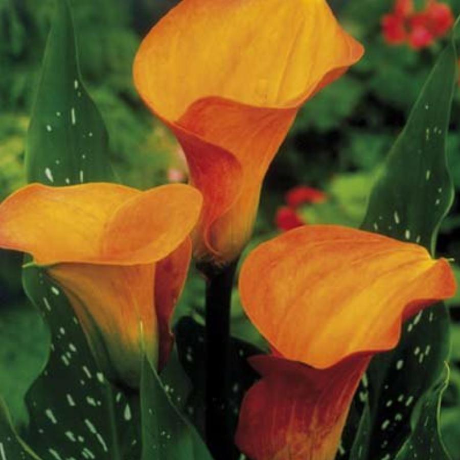 Калла принадлежит к семейству ароидных. Сорта с цветным покрывалом, произошедшие от Золотисто-желтой каллы Элиотта и розово-красной каллы Ремани, не привышают в высоту 60 см. Менее требовательна к влажности почвы и воздуха, любят яркий рассеяный свет.