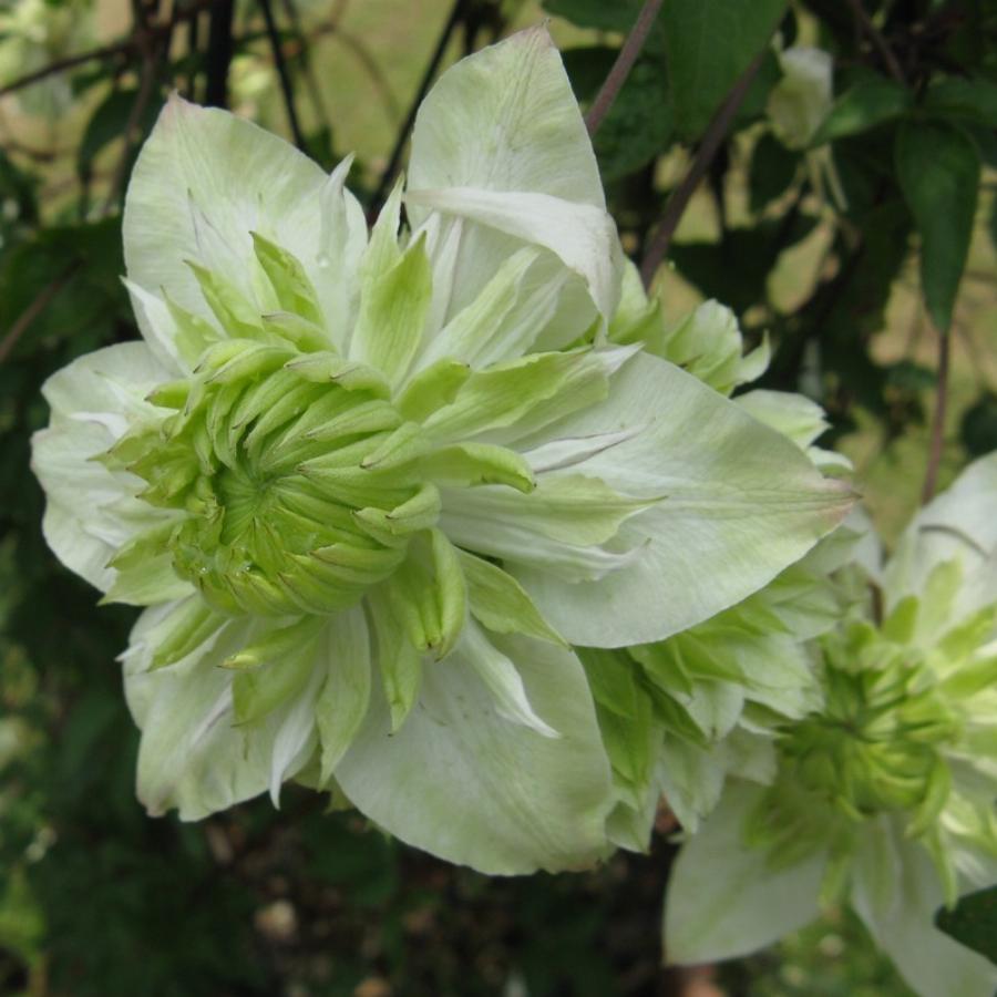 3 группа обрезки, цветет на побегах текущего года. Группа Флорида. Кустарниковая лиана длиной 1,5-2 м. Цветки махровые, диаметром 6-8 см, бледно-зеленого цвета, выгорают до белого. Цветет с июля до заморозков. Предпочтительней высаживать на южной стороне. Требует хорошего укрытия на зиму. Хорошо подходит для контейнегного выращивания.