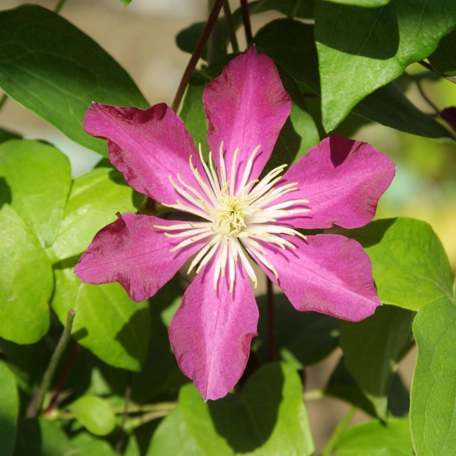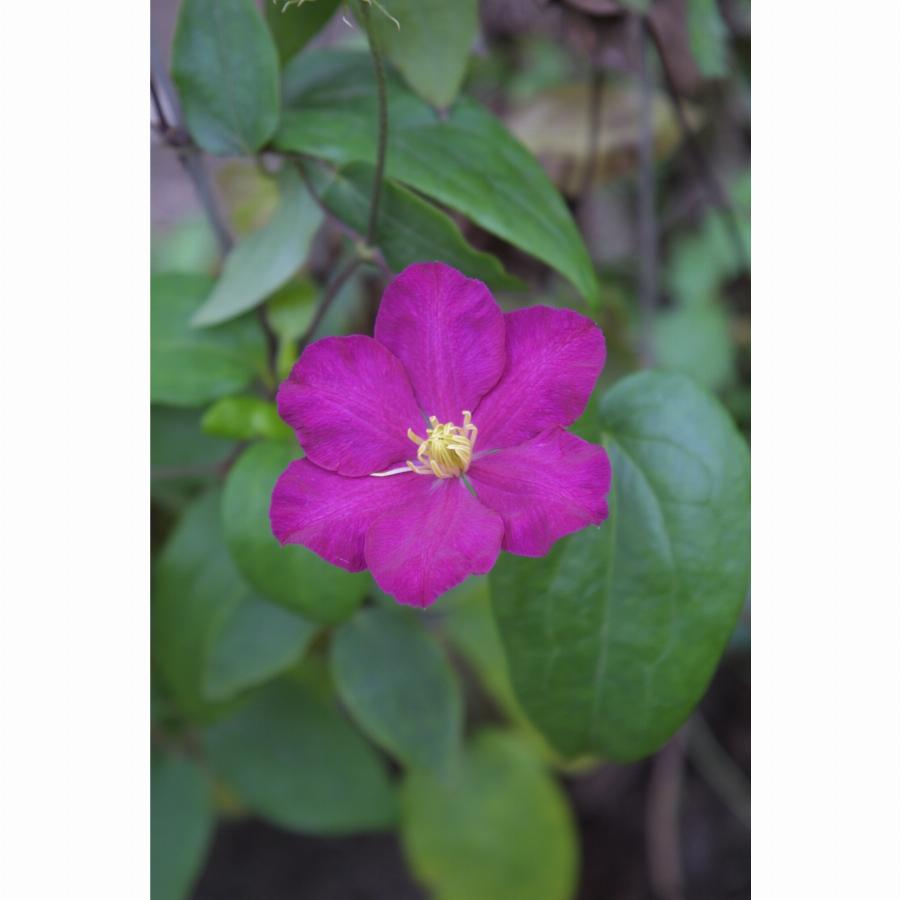 2 группа обрезки. Цветет на побегах прошлого и текущего года. Лиана длиной до 3 м. Цветки раскрытые, 12-14 см в диаметре. Чашелистиков 6 (5-7), они широкие, обратнояйцевидные, окраска малиново-красная, ровная, затем слегка выгорает. Пыльники желтые. Цветет в мае-июне на побегах прошлого года, в середине лета повторно на побегах текущего года, но менее обильно. На одном побеге до 10 цветков.