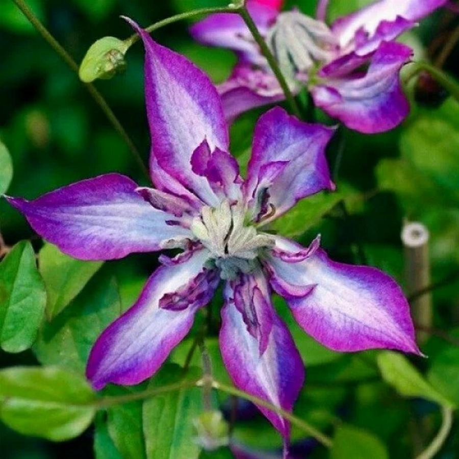 3 группа обрезки, цветет на побегах текущего года. Высота до 2,5 м. Крупные цветки (около 8 см в диаметре) Немахровые волнистые лепестки имеют интересный окрас. Фиолетовые края выразительно оттеняются широкими белоснежными полосами в центре. Тычинки цветов светлые. Пыльники коричневые. Цветение с конца июня по сентябрь. Обильно цветет. Зимостойкость хорошая.