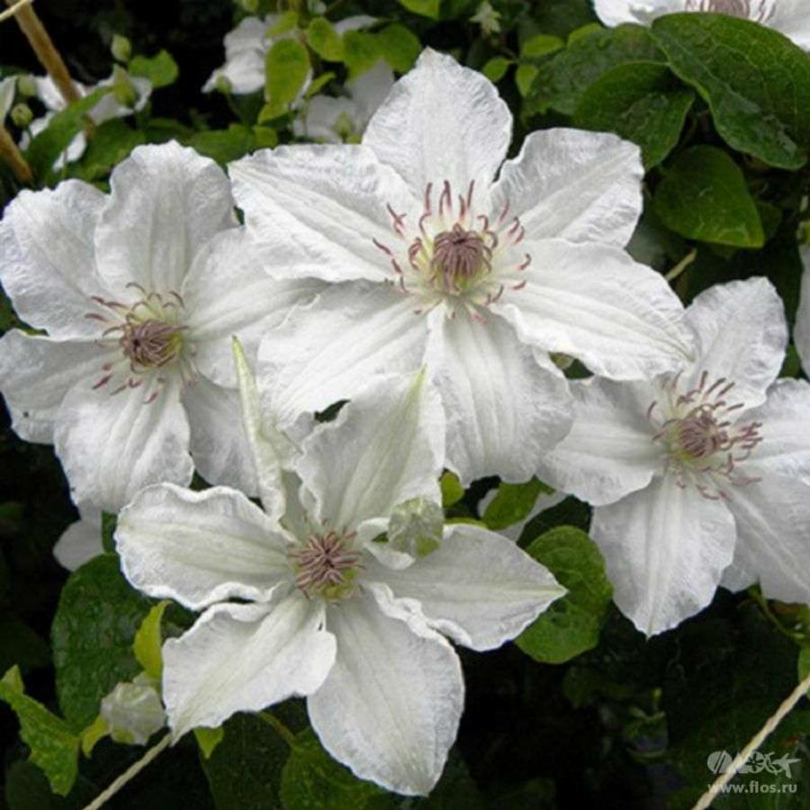 2 группа обрезки, цветет на побегах прошлого и текущего года. Высота растения: 2 м. Крупноцветковый раннецветущий сорт. Цветки белоснежные. Диаметр цветка от 7 до 10 см. Лепестки овальной формы, заостренными кончиками и гофрированными краями. Листва тройчатая. Цветение с мая по июнь, повторное цветение с июля по август.