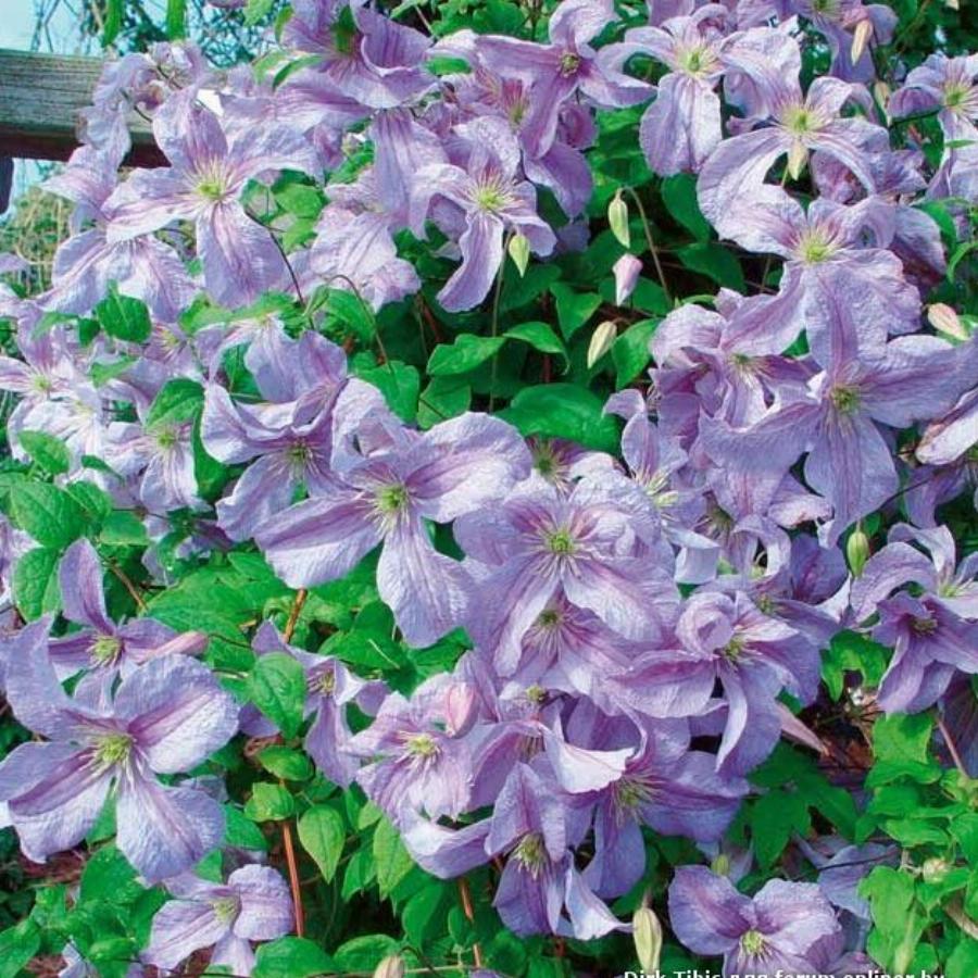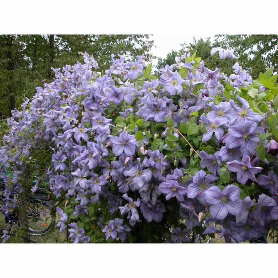 3 группа обрезки, цветут на побегах текущего года. Обильно цветущий польский сорт. Цветки светло-голубые с фиолетовым оттенком с более темной полоской по середине лепестка и кремовыми тычинками до 10 см в диаметре. Высота растения 3-4 м. Цветение с июня по сентябрь.
