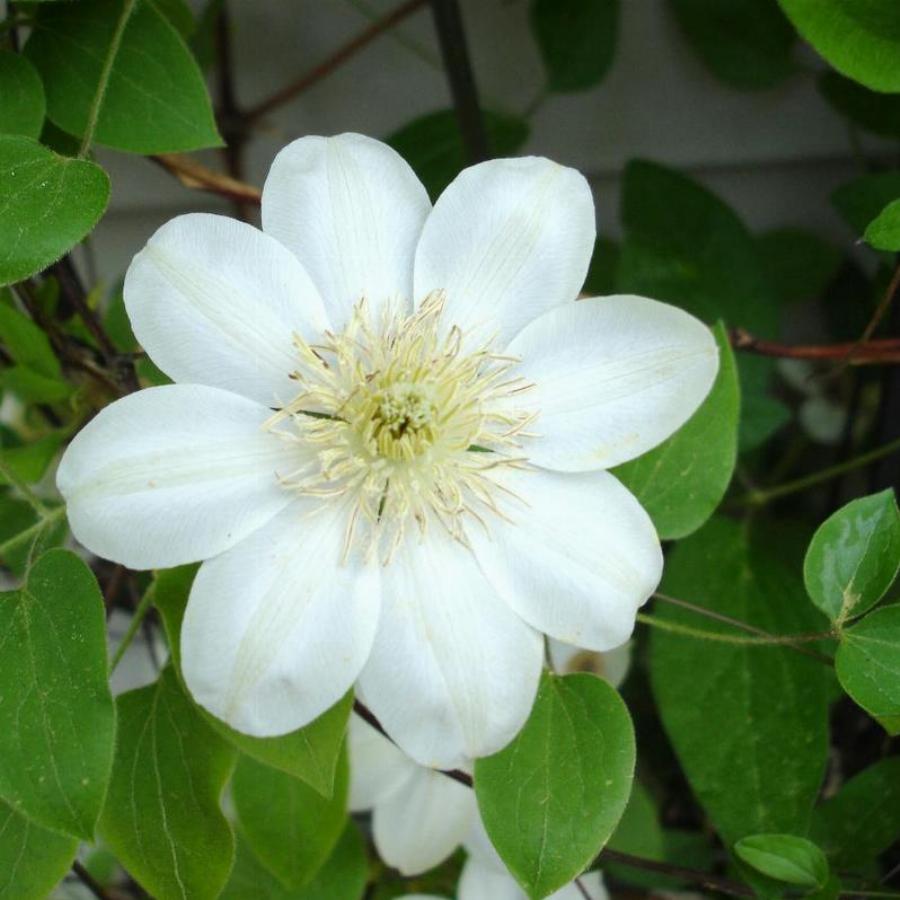 2 группа обрезка, цветет на побегах прошлого и текущего года. Высот а растения 2-3 м. Размер цветка (см) 10- 15. Цвет белый с желтым оттенком и зеленой полосой по центру. Длина лианы 3м. Период цветения май- июль, август- сентябрь.