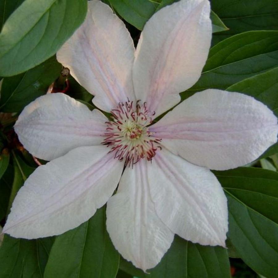 2 группа обрезки, цветет на побегах прошлого и текущег года. Отличается крупными, алебастрово-белыми цветами, с розовыми прожилками, которые проявляются осенью. Пыльники темно-красные. Цветение обильное. Особенно выигрышно смотрится при посадке на темном фоне. Цветет в мае-июне, августе-сентябре. Высота 2-3 метра. Диаметр цветка 14-18 см