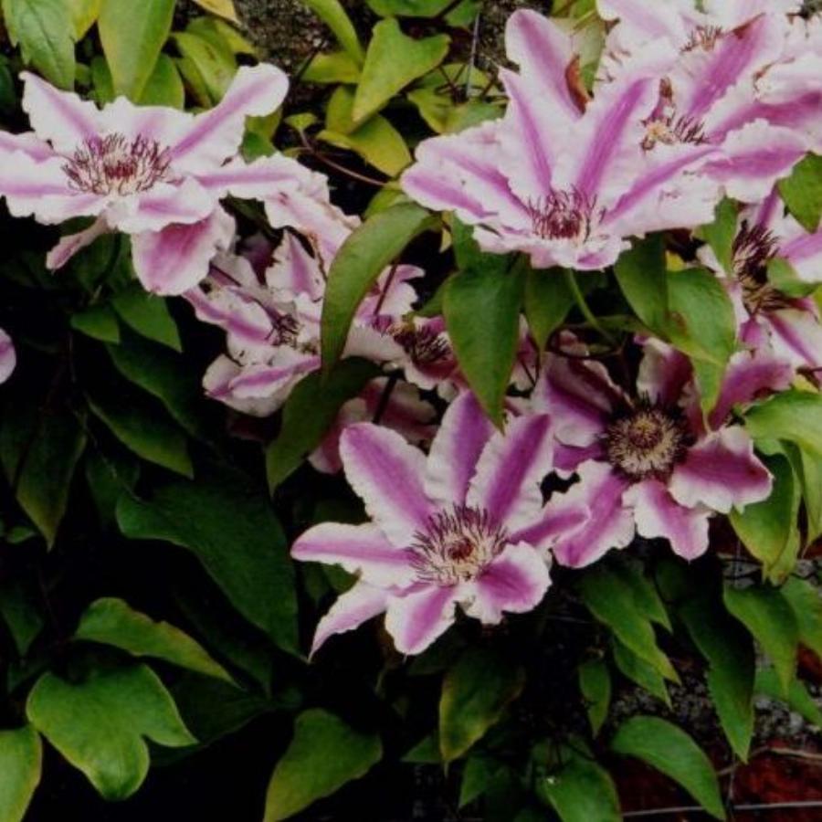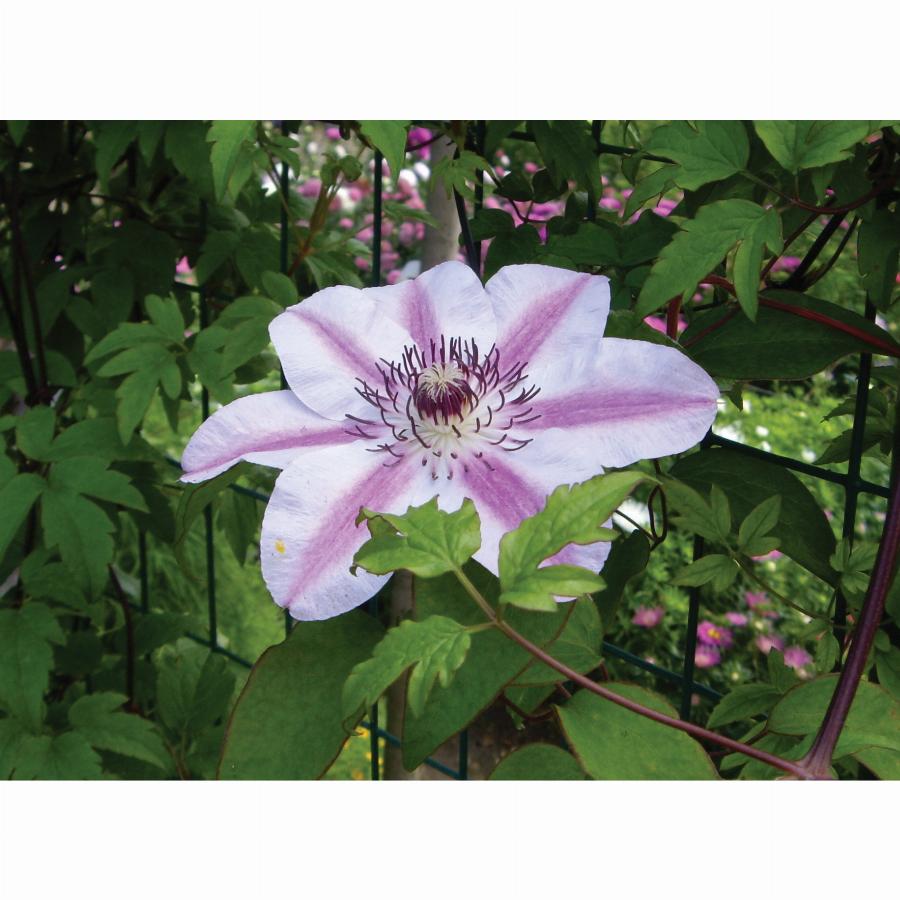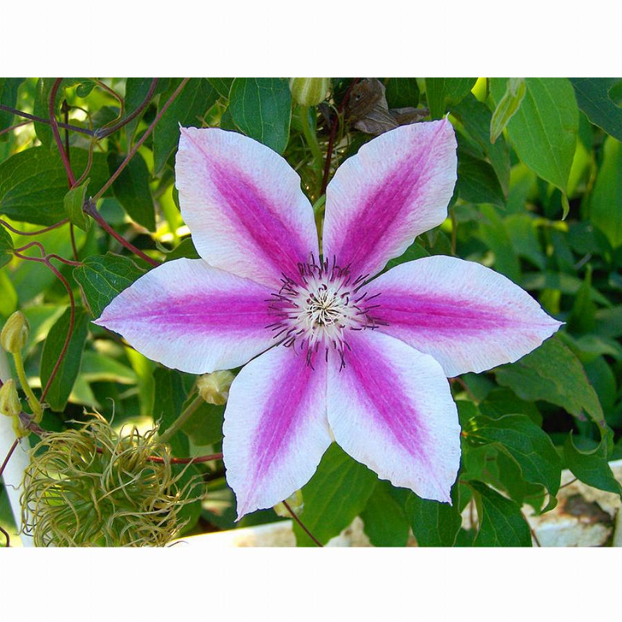 2 группа обрезки, цветет на побегах прошлого и текущего года. (Capitaine Thuilleaux) Высота: 2-3м. Диаметр цветка: 10-20 см. Цветение: 5-6/7-8 месяц. Цветы белые с розово-вишневой полосой по центру лепестка.