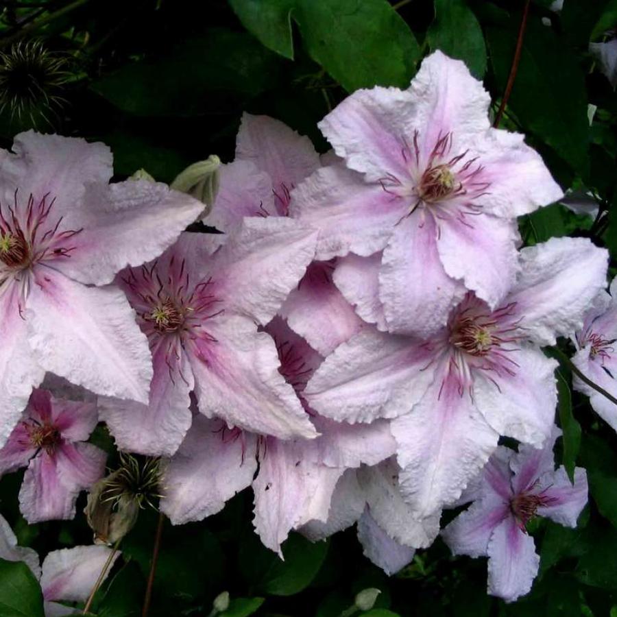 3 группа обрезки, цветет на побегах текущего года. Этот сорт высотой 1,5-2м, обильноцветущий, его цветы звездообразной формы, диаметром 10-13 см, нежно-розовые с перламутровым оттенком и волнистыми краями, к центру цветка окраска становится более яркой. Пыльники пурпурные. Зимостойкий, устойчивый к болезням сорт.