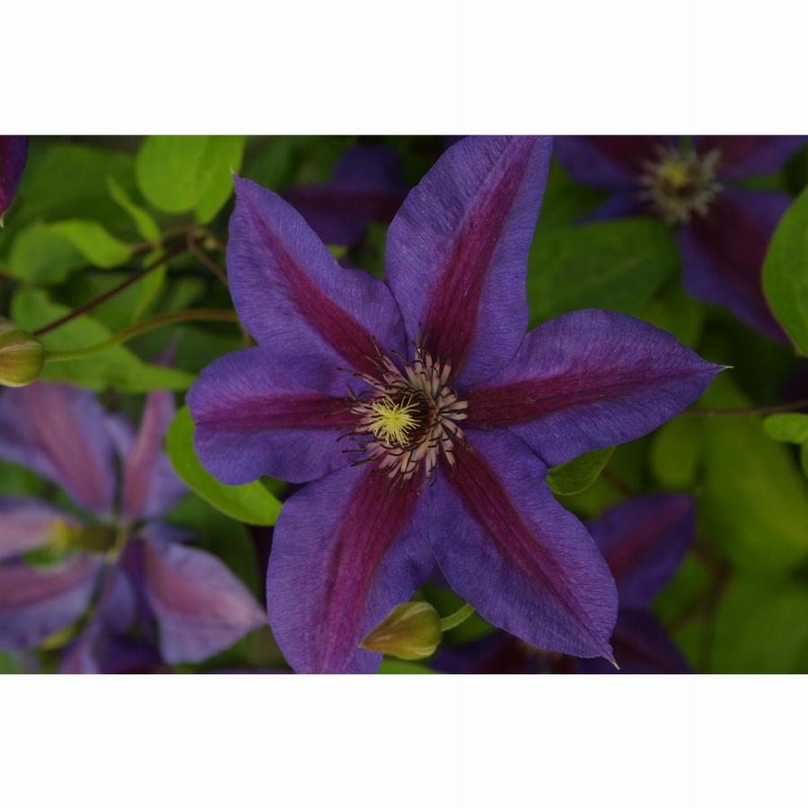 2 группа обрезки, цветет на побегах прошлого и текущего года. Яркие двуцветные цветки имеют голубые лепестки с бархатисто-красной полоской посередине и красные тычинки. Цветение обильное в мае-июне, августе-сентябре. Высота 2-3 метра. Диаметр цветка 14-18 см. Зимостойкость -35 С.