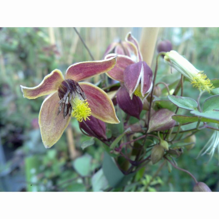 Лиана высотой до 3 м. Листья сизоватые. Цветки мелкие, красно-коричневые снаружи и желтые внутри. Цветет обильно с июля до заморозков. Здоровая, плотная листва. Сорт неприхотлив. Не требует обрезки!