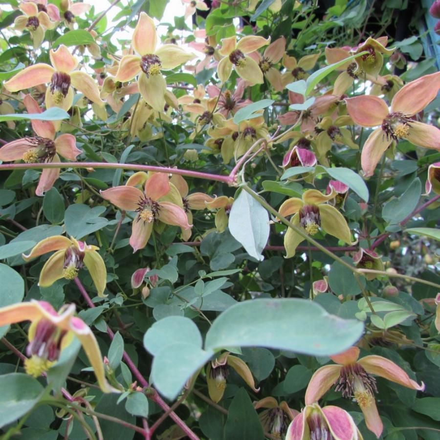 Лиана высотой до 3 м. Листья сизоватые. Цветки мелкие, красно-коричневые снаружи и желтые внутри. Цветет обильно с июля до заморозков. Здоровая, плотная листва. Сорт неприхотлив. Не требует обрезки!