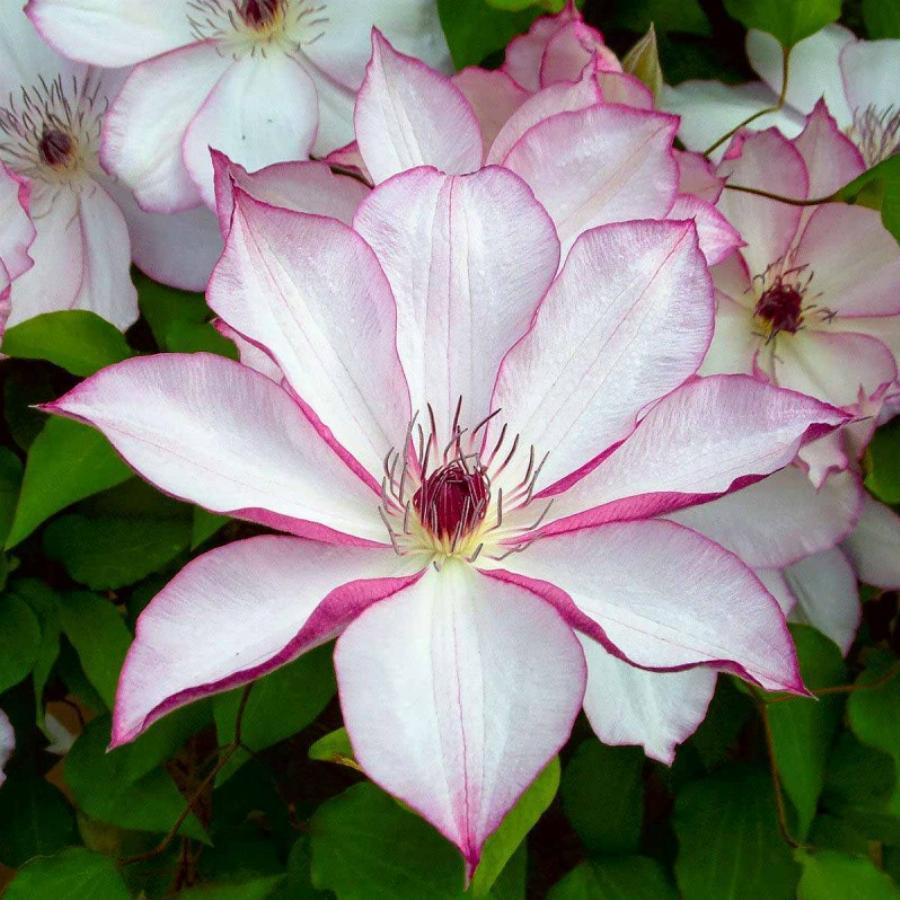 2 группа обрезки, цветет на побегах прошлого и текущего года. Японский сорт с белыми или светло-розовыми цветками с розовыми или розово-пурпурными краями лепестков. Цветки диаметром около 16 см, с 6-8 лепестками. Тычинки с фиолетово-красными пыльниками на кремовых нитях. Дорастает до 2-3 м. Самое обильное цветение с мая по июнь, менее интенсивное с августа до конца сентября.