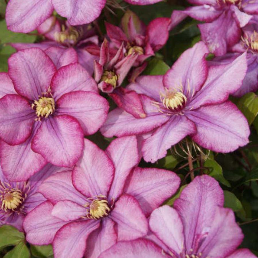 2 граппа обрезки. Цветки диаметром 8-12 см, весной полумахровые. Лепестки светло-красные с тёмной красно-фиолетовой каймой и бледно-фиолетовой полосой по центру. Тычинки тёмно-красные с жёлтыми пыльниками. Цветёт в мае-июне на прошлогодних побегах и в июле-августе на побегах текущего года. Высота 150- 200 см. На зиму в средней полосе требуется обязательное укрытие. Зона 6 (до -18?С).