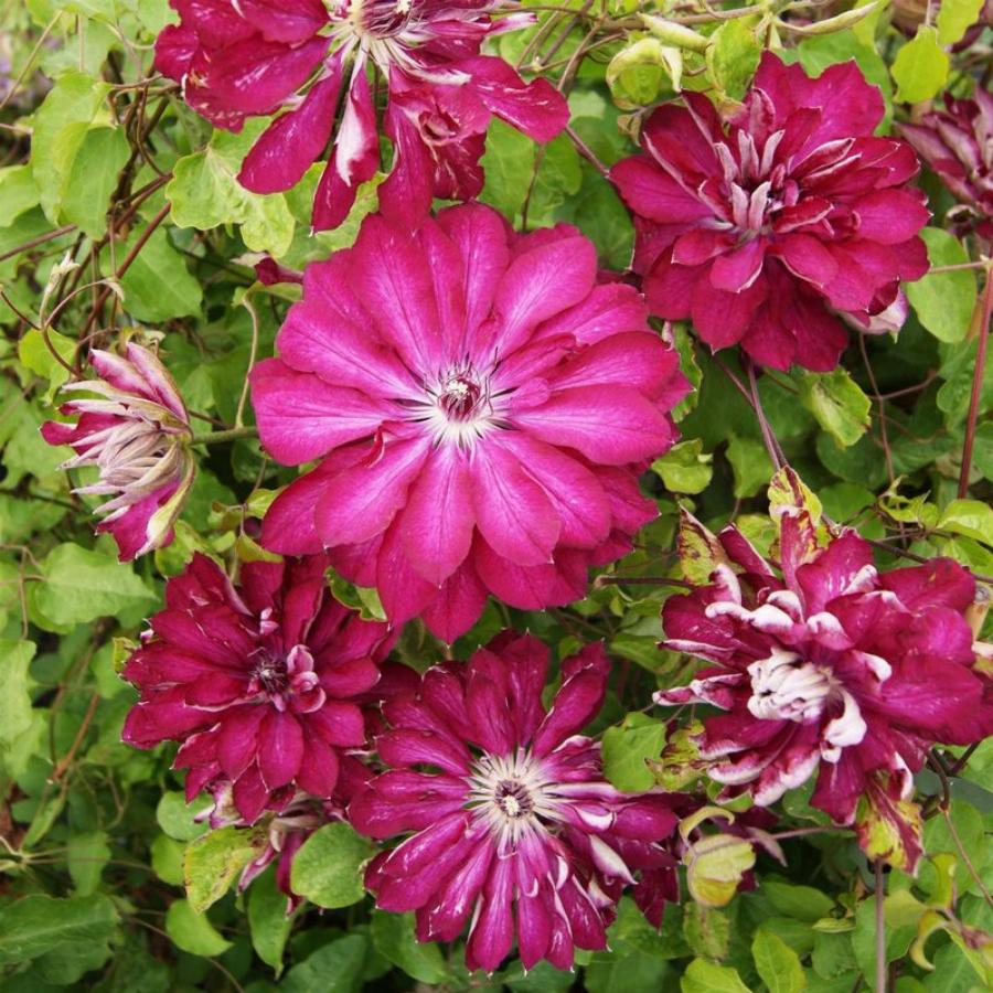2 группа обрезки. Плети 2,0 метра, легко направляются. Цветки махровые малиново-красные, лепестки не волнистые, 12 см, чашелистики заостренные, нити у тычинок темные, пыльники коричневые. Цветет на прошлогодних и текущих побегах, обильно и продолжительно. Зона зимостойкости 4. Клематис — любимый многими садоводами многолетник, относится к группе лиан.