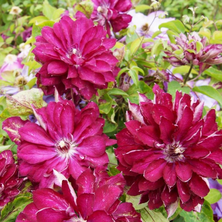2 группа обрезки. Плети 2,0 метра, легко направляются. Цветки махровые малиново-красные, лепестки не волнистые, 12 см, чашелистики заостренные, нити у тычинок темные, пыльники коричневые. Цветет на прошлогодних и текущих побегах, обильно и продолжительно. Зона зимостойкости 4. Клематис — любимый многими садоводами многолетник, относится к группе лиан.