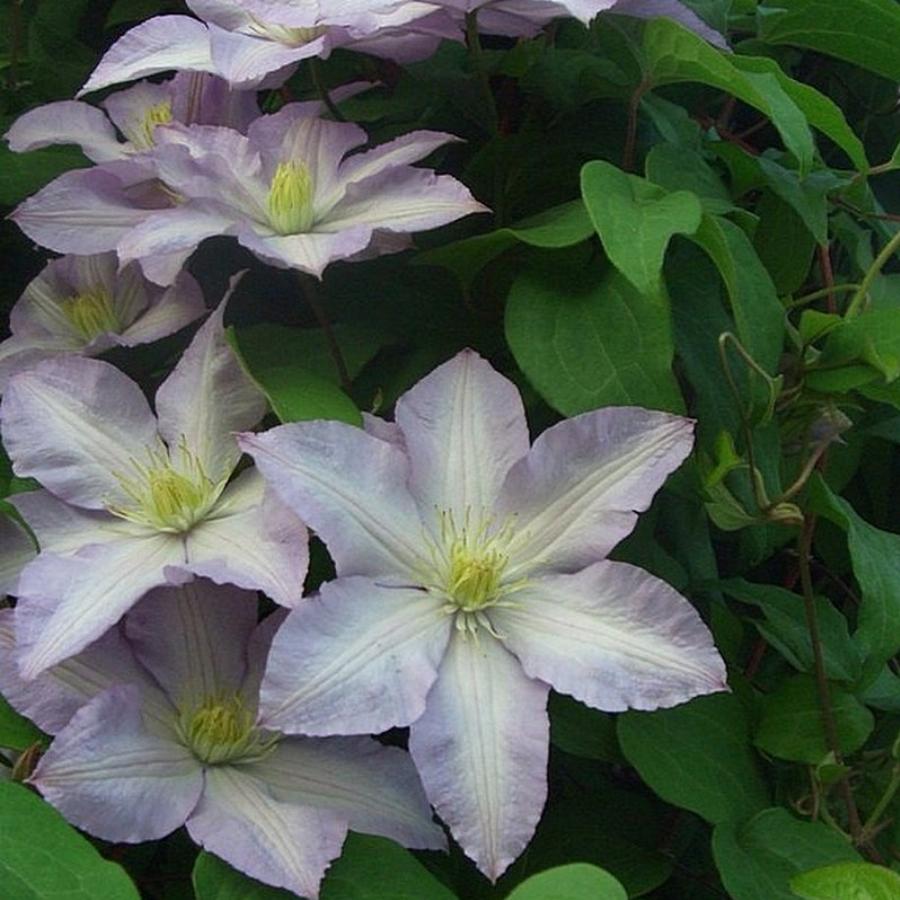 3 группа обрезки, цветет на побегах текущего года. Группа Жакмана. Крупноцветковый клематис (12-16см) белого цвета со светло-сиреневой окантовкой лепестков, пыльники желтые. Цветение обильное, особенно в августе. Высота растения 2-2,5 м. Цветение с конца июня до сентября.
