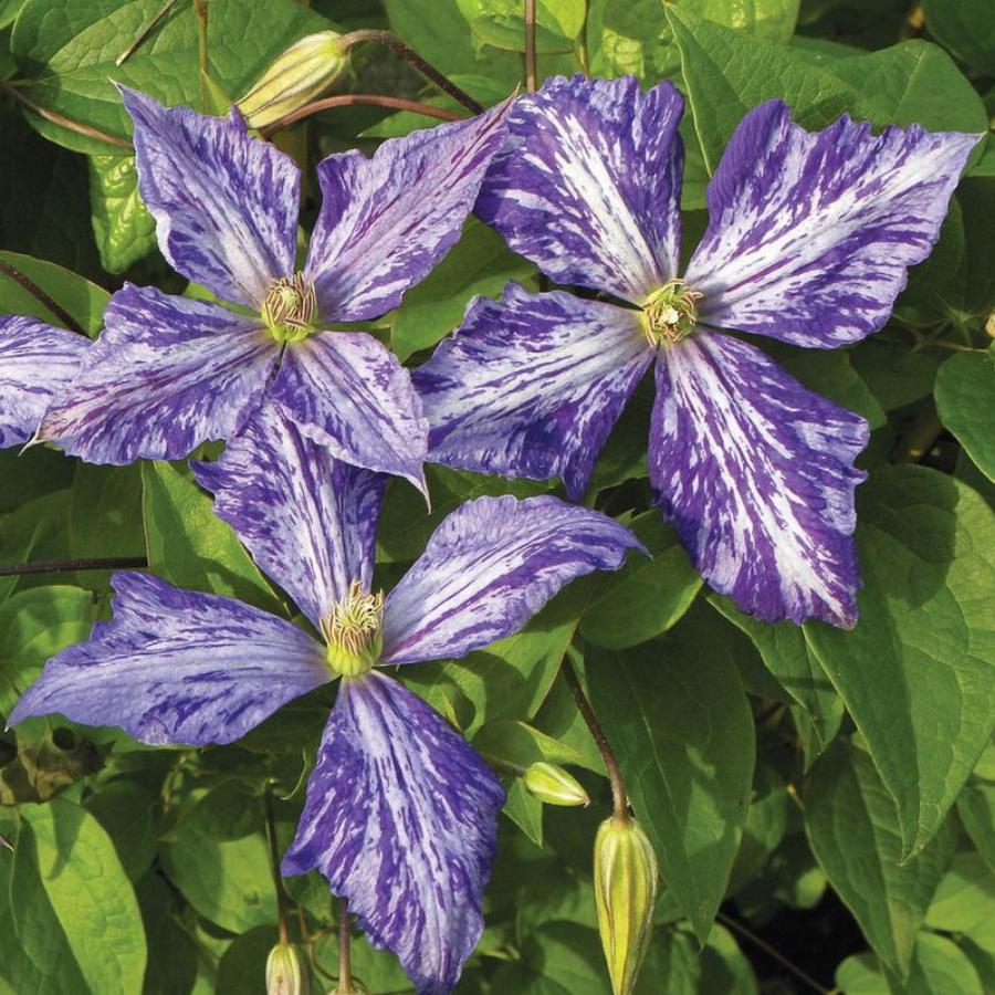 3 группа обрезки, цветет на побегах текущего года. (Tie dye). Клематис выделяется на фоне остальных своей оригинальностью. Довольно крупные (10–15 см в диаметре) пурпурно-синие цветки с мраморно-белыми штрихами. Красные пыльники на бледно-зелёных тычиночных нитях. Обильное цветение в июне – августе. Высота – 3–4 метра.