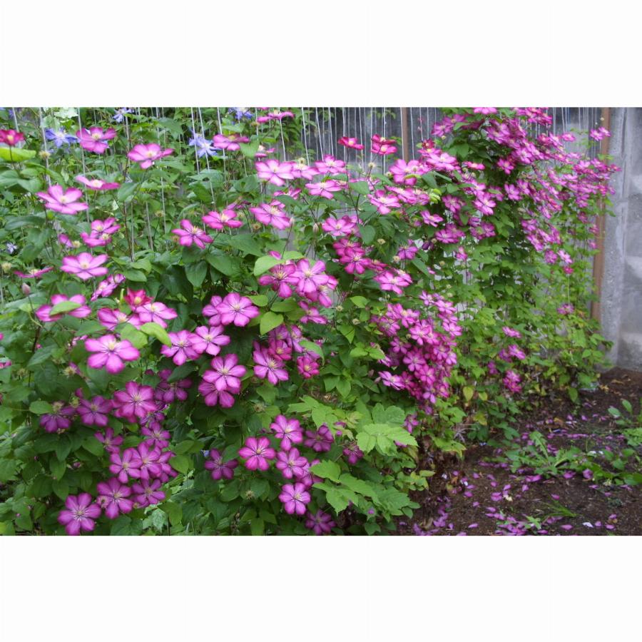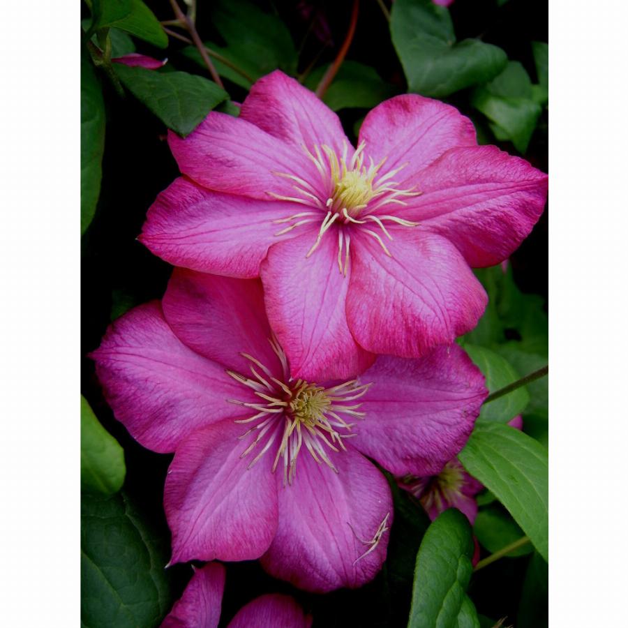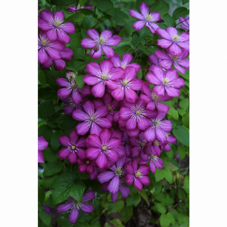 3 группа обрезки, цветет на побегах текущего года. Растение высотой 3,5 м. Лепестков 6, обратно-яйцевидные, остроконечные, красно-пурпурные, средняя полоса светлее, края и жилки выпуклые, более тёмные. Пыльники светло-жёлто-зелёные.