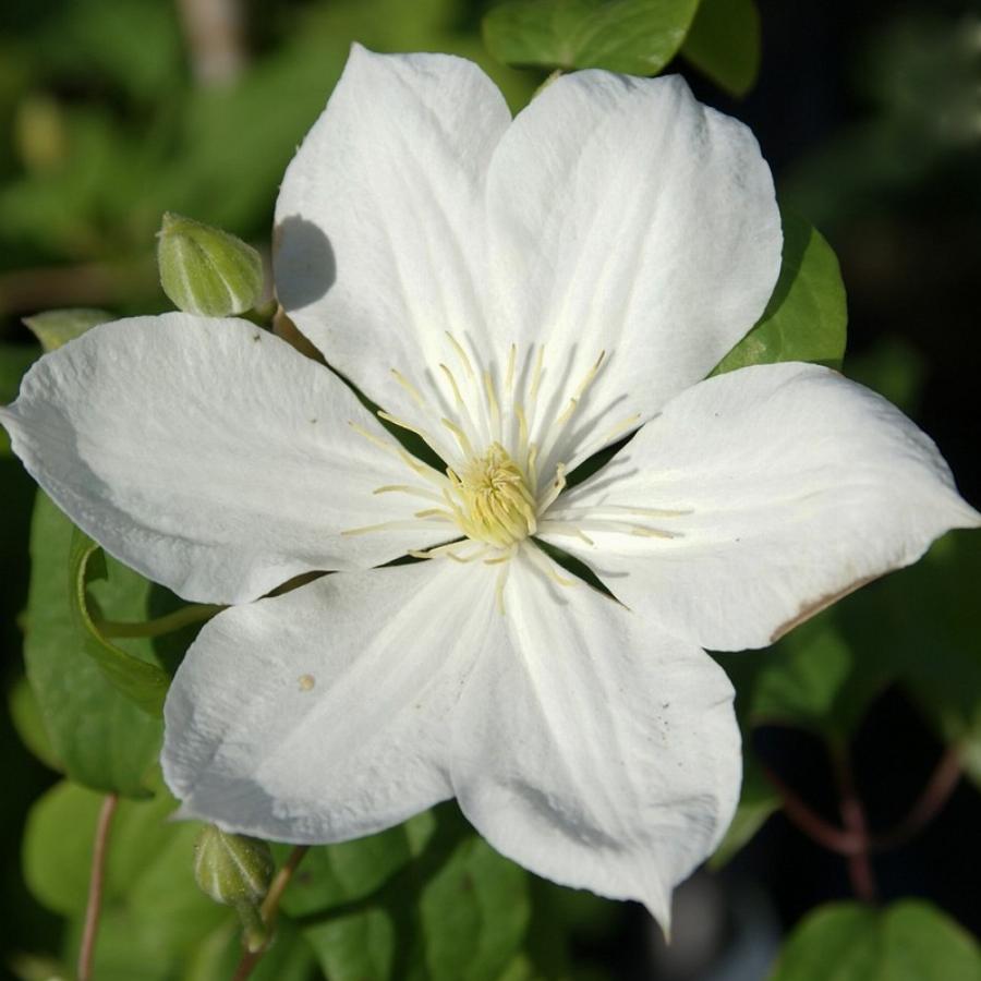 2 группа обрезки, цветет на побегах прошлого и текущего года. Растение высотой 1,8-2,4 м.(The Bride) — название переводится как «Невеста». Цветы чистого, белого цвета,: от 12 до 15 см. Цветут эти клематисы с весны до осени, что также является немаловажным преимуществом данного сорта. Устойчив к болезням, зимостойкий.