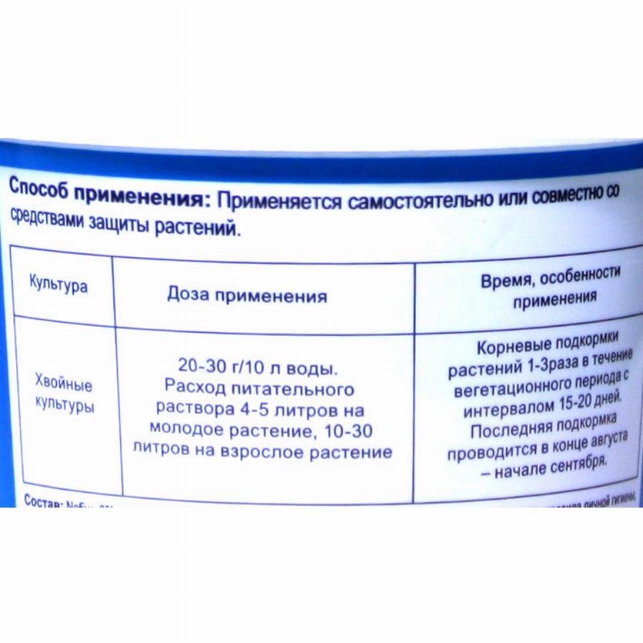 Удобрение идеально подходит для питания и подкормок любых видов хвойных культур. Обеспечивает: активный рост растений; сбалансированное питание макро- и микроэлементами; препятствует потере зеленого цвета; предохраняет хвойные культуры от побурения хвои; повышает устойчивость к неблагоприятным условиям; улучшается сопротивляемость растений к болезням.