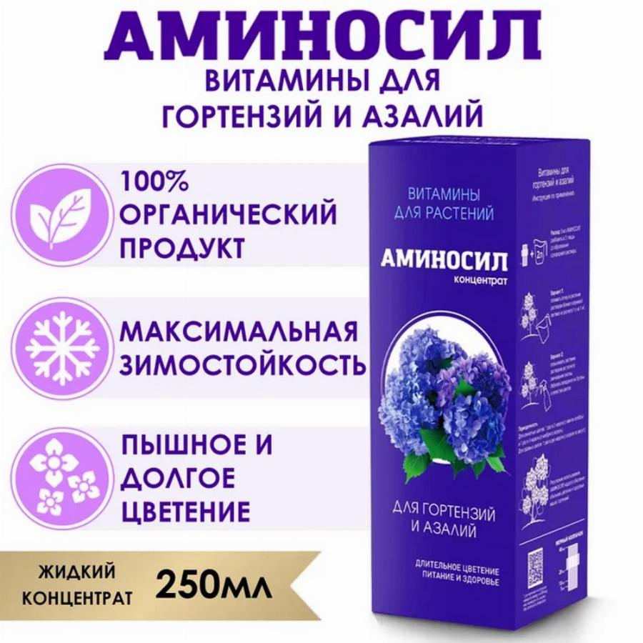 Полный комплекс витаминов для гортензий и азалий. Впервые в России! 100% органический состав. Аминосил создан для полноценного сбалансированного питания всех типов гортензий и азалий. Витамины Аминосил укрепляют растение, защищают корневую систему, формируют сильный естественный иммунитет, повышает стрессоустойчивость. Аминосил выполняет для гортензий и азалий ту же функцию, что и традиционные витамины для человека, позволяя жить полноценной здоровой жизнью даже при стрессовых ситуациях. Благодаря микро и макро-элементам органического происхождения Аминосил дарит гортензий длительное и интенсивное цветение, а так же обеспечивает качественный рост и развитие растения. Витамины Аминосил принимают активное участие в процессе метаболизма растений. По сути, они представляют собой элементы или кирпичики, благодаря которыми происходит строительство растительных клеток.