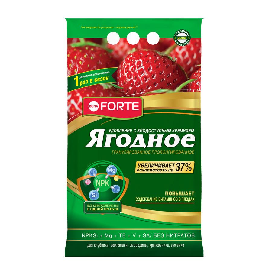 Удобрение пролонгированного действия для клубники, земляники, чёрной и красной смородины, крыжовника, жимолости и ежевики. Увеличивает размер плодов, повышает сахаристость и стимулирует образование завязей.