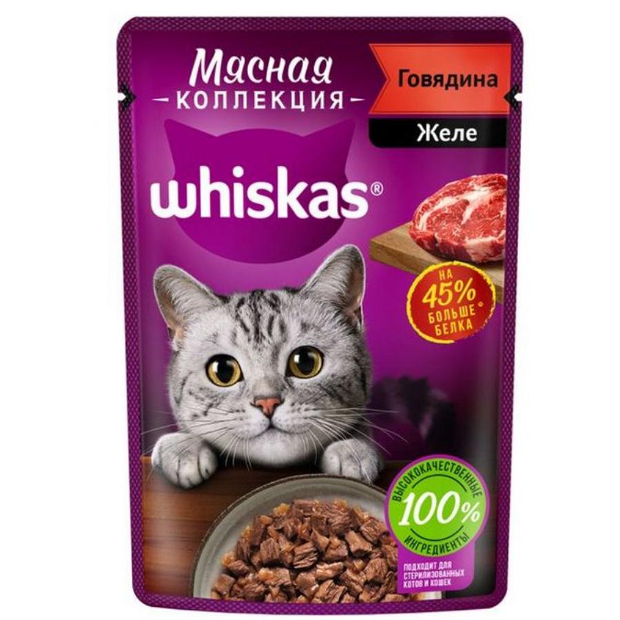 «Мясная коллекция» для замурррчательной жизни. Это палитра мясных блюд, которые обладают особой волокнистой текстурой. Мы готовим их в нежном соусе или желе и упаковываем в паучи. Порадуйте вашу кошку сочными кусочками с говядиной и доставьте ей максимум удовольствия. Подходит для стерилизованных котов и кошек. WHISKAS для взрослых кошек это: Оптимальный баланс питательных веществ для полноценной жизни. 100% сбалансированный рацион. Всё необходимое для поддержания здоровья: Омега-6, кальций, фосфор и таурин, витамин Е, цинк. Вкусное питание с высоким содержанием белка на каждый день. На 45% больше белка в каждой порции 100% натуральные высококачественные ингредиенты: мясо и субпродукты – без добавления ароматизаторов и консервантов. Ваша кошка будет мурчать от удовольствия!