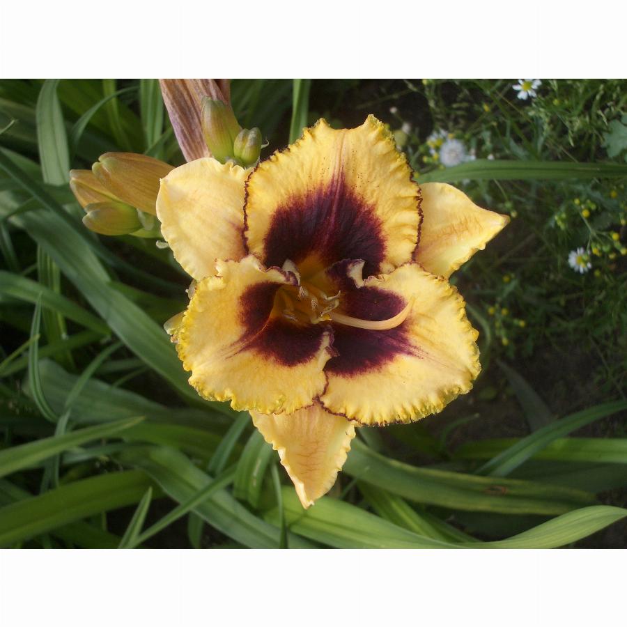 Великолепный сорт с нежно-желто-бежевыми гофрированными цветками с бордовой звездой в центре.