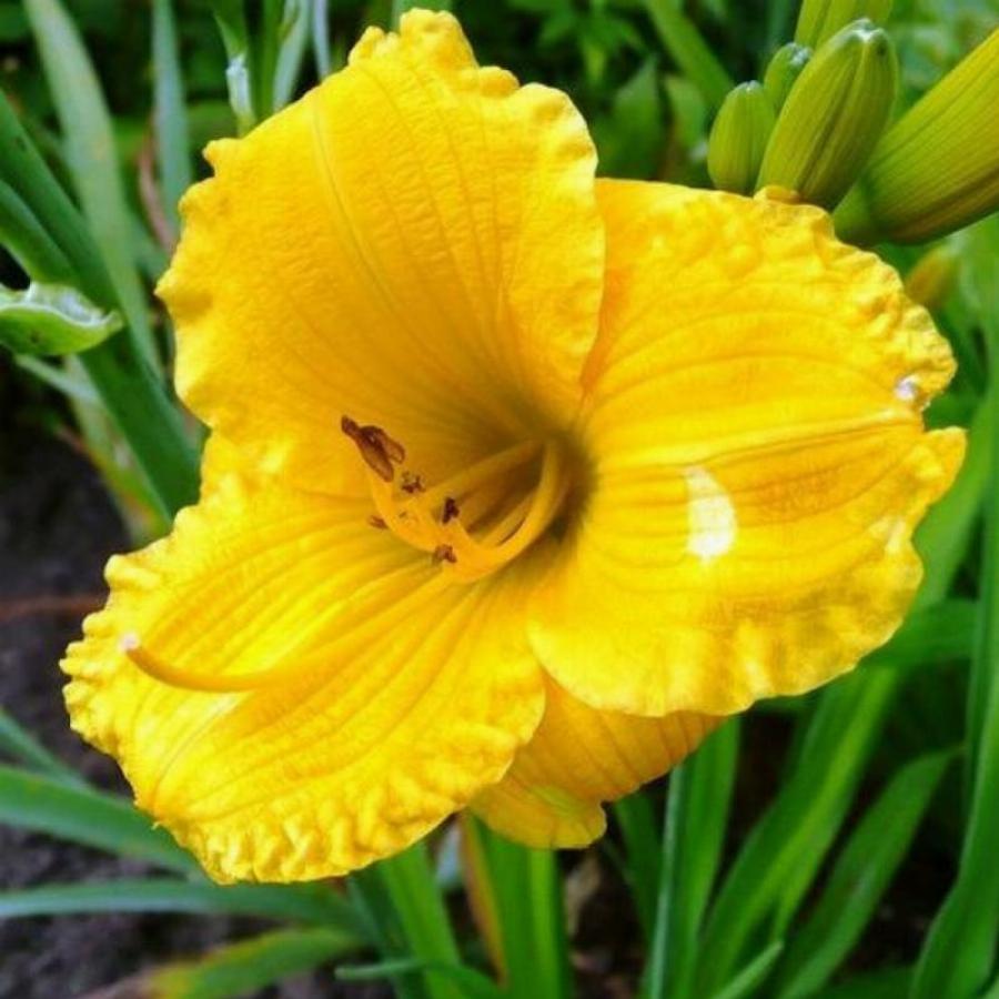 Мелкоцветковый cорт лилейника. Цветы лилейника золотисто-жёлтые, однотонной окраски. Высота растения 65 см. Цветение июнь-июль, очень обильное.