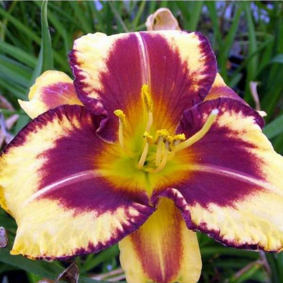H = 50 — 60 см, цветение июнь — август, кремово-жёлтый с фиолетовыми пятном и каймой.