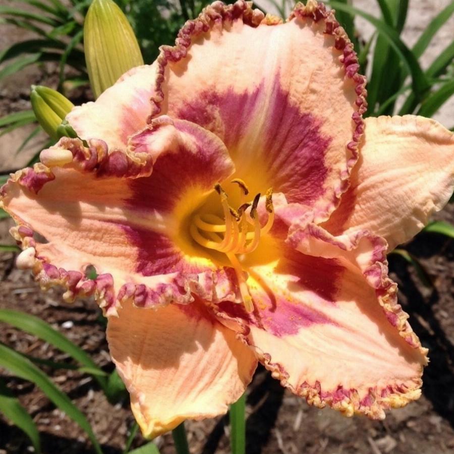 Кремовый, глаз и внутренняя кайма — розово-лиловые, внешняя кайма — кремовая, зелёное горло.