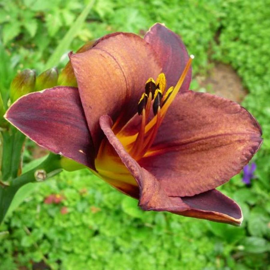 Цветки шоколадно-фиолетовой окраски с бордовым краем диаметром 15 см. Высота цветоносов 70 см. Тетраплоид. Характерно повторное цветение. Относится к группе полувечнозелёных лилейников.