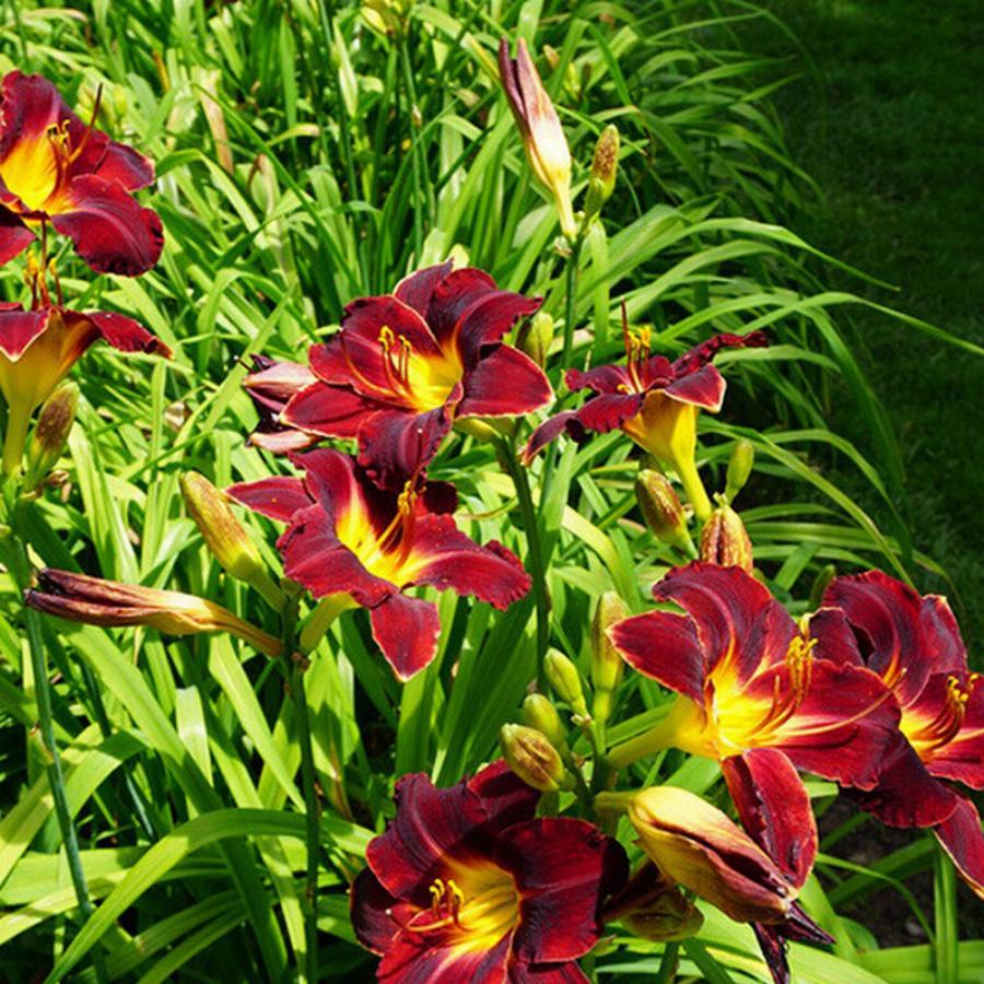 Высота 75см. Период цветения июль-август. Цветение однократное, продолжительное. Цветок бордово-красный с желтым горлышком. Диаметр цветка 15 см. Морозостойкость: 4 зона (-28/-34?C)