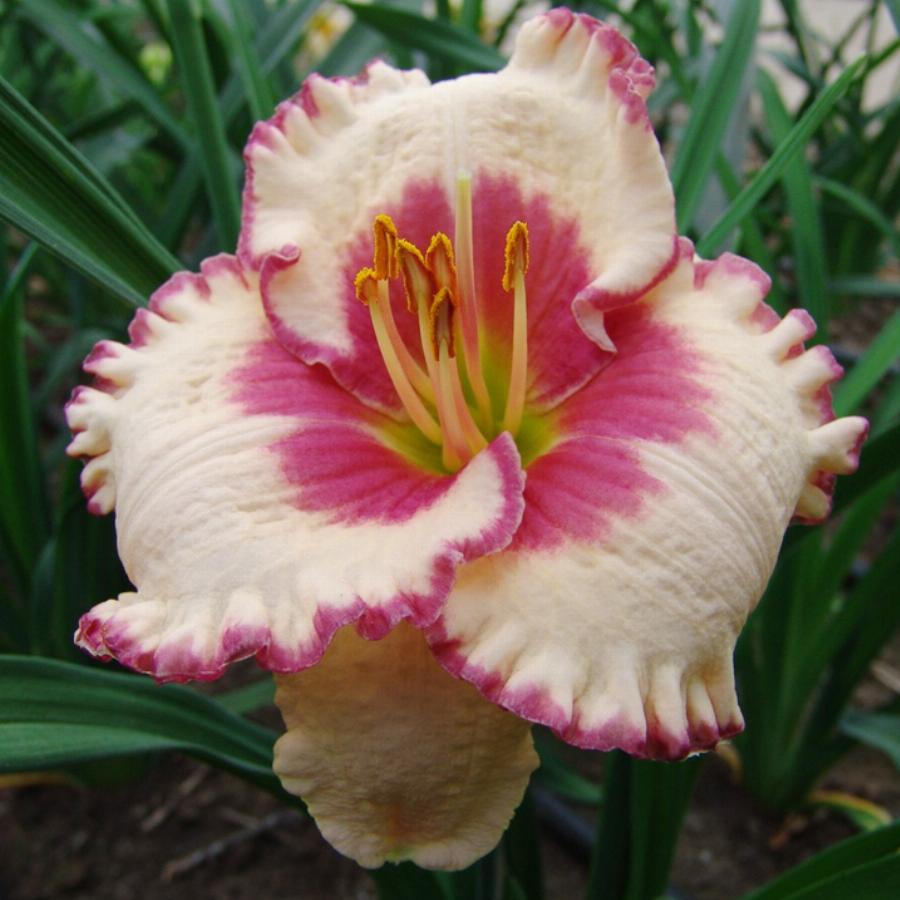 Кремовый цветок с ярко-красным горлом и тонкой расной каймой, диаметр цветка около 13 см, раннего срока цветения, повторно цветёт в начале осени, тетраплоид, вечнозелёный.