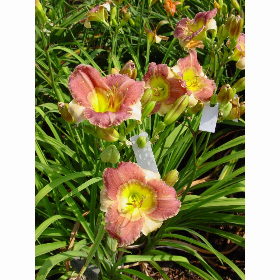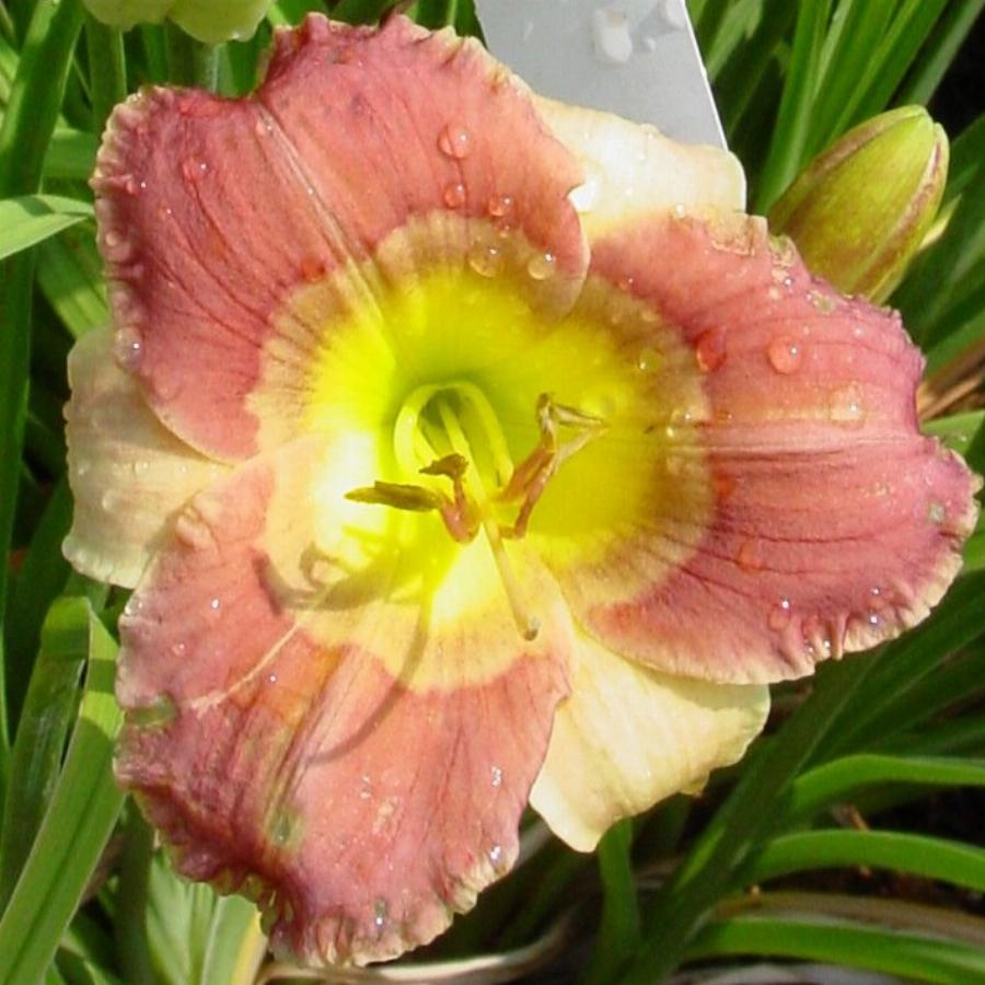 Высота растения около 0.7 м. Цветок размером около 10 см, двуцветный. Нижние лепестки кремовые, верхние темно-розовые с гафрированым краем. В центре цветка-желтый глазок.