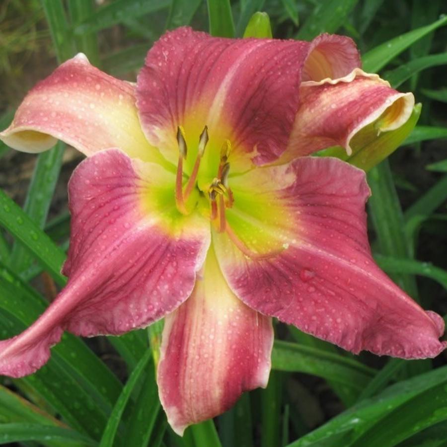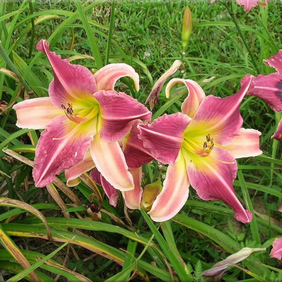 Высота до 70 см.Двухтонный орхидейно-лавандовый со светло-фиолетовым ободком над желтым горлом. Полувечнозеленый тетраплоид. Раннего срока цветения.