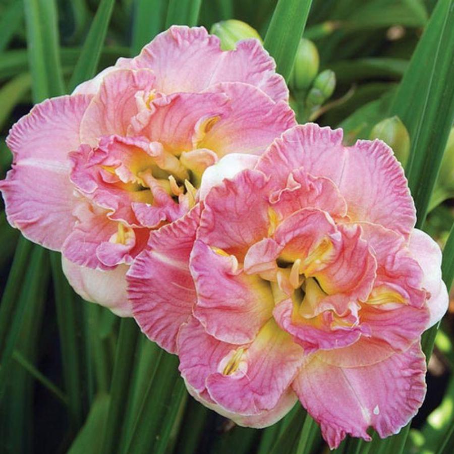 Махровый кораллово-розовый цветок с гофрированными краями и жёлтым горлом, диаметр цветка около 10 см, среднего срока цветения, диплоид, вечнозелёный, в тёплом климате повторно цветёт в начале осени. Высота 40-50см.