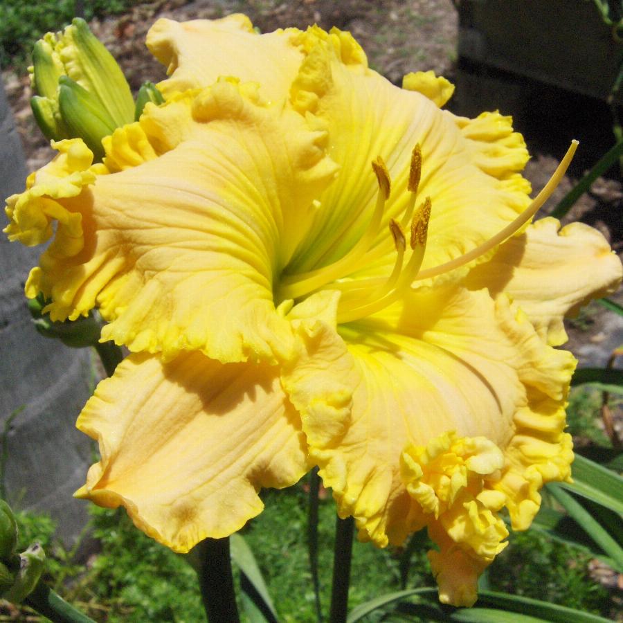 Высота куста до 80 см. Цветок до 15 см. в диаметре. Яркие желтые с легким румянцем цветы с гофрированным по максимуму краем лепестков и зеленым горлом. Высокие, ветвистые цветоносы с многочисленными бутонами
