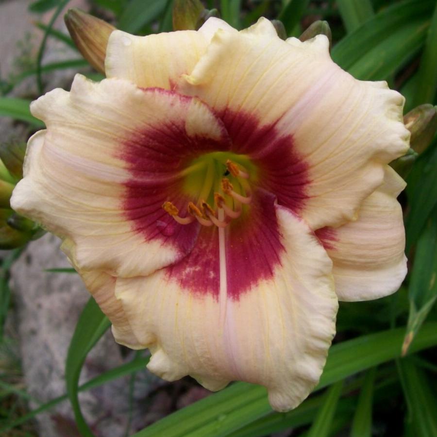 H = 50 -60 см, цветение июнь — август. Звездчатые, светло-кремовые цветки с ярко-пурпурными глазками, повторно цветут в сентябре.