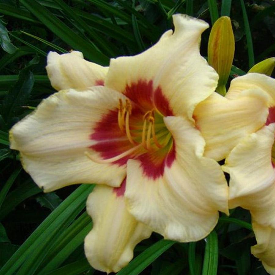 Сорт 1992 года. Многолетнее корневищное растение 60-65 см высотой, с широколинейными, цельнокрайними, прямыми или дуговидно изогнутыми листьями. Цветки до 11,5 см в диаметре, кремовые, красно-малиновым глазом и зеленым горлом, собраны в раскидистые соцветия. Раннего срока цветения, повторно цветущий. Цветение обильное. Предпочитает освещенные места и проницаемые, влажные, плодородные почвы. Засухоустойчив. Зимостоек. Отзывчив на удобрения, особенно в момент заложения цветочных бутонов. Долговечен, без пересадки растет 5-6, до 10 лет. Размножают делением корневища, в апреле-мае или в сентябре. Стабильно декоративен. Партнеры: многие многолетники, в том числе хоста, астильба, бадан, папоротники, ирисы, анемона гибридная. Используют в группах, рабатках, миксбордерах, у водоемов, а также в одиночных посадках.