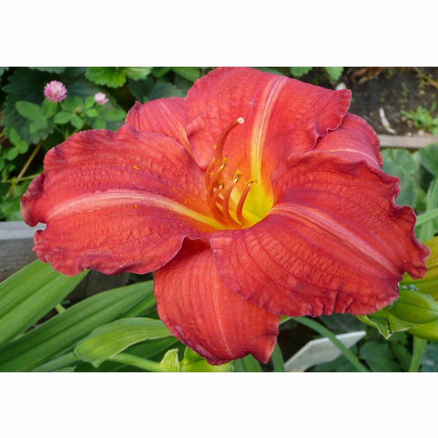 Высота растений – до 0,4 м. Зацветает в начале августа. Цветки ярко-красные, по краям волнистые. Лепестки имеют желтые прожилки, в центре цветки желто-зеленые.