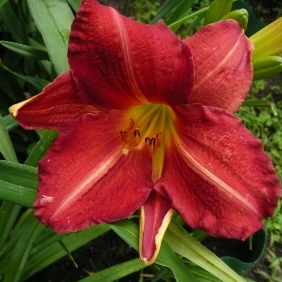 Высота растений – до 0,4 м. Зацветает в начале августа. Цветки ярко-красные, по краям волнистые. Лепестки имеют желтые прожилки, в центре цветки желто-зеленые.