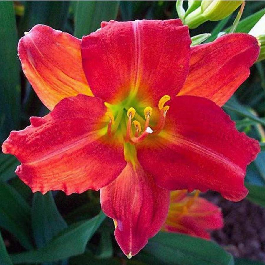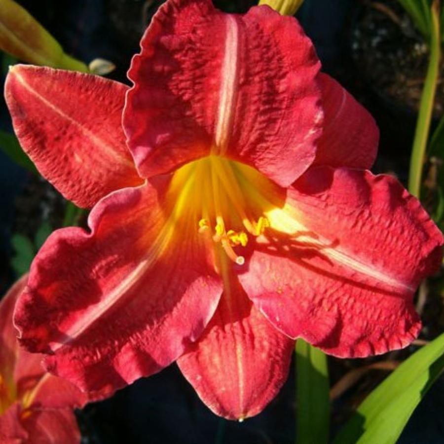 Ярко-красные цветы с легкой гофрировкой края. Светлая средняя линия, желто-зеленое горло. Полувечнозеленый, диплоид. Высота — 40 см; диаметр цветка — 10 см.