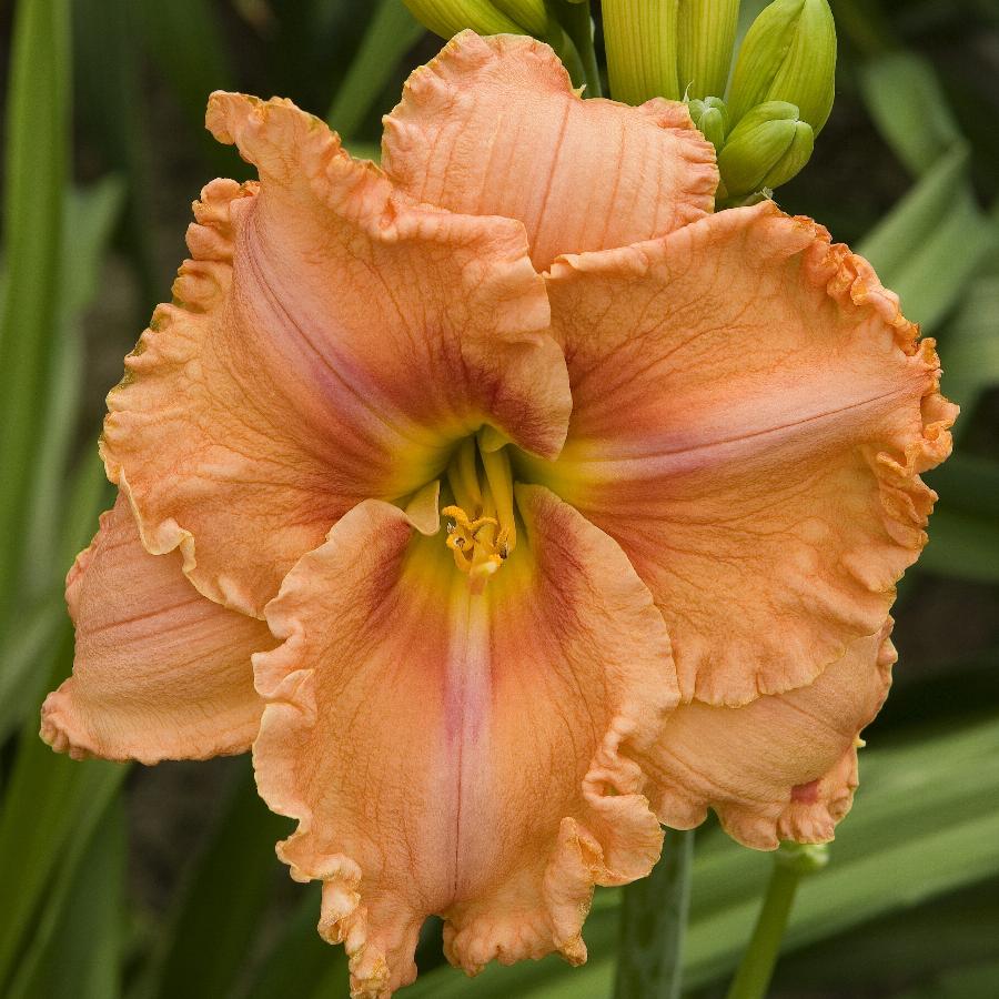 Высота растения.-0,75 м. Диаметр цветка-16 см. Крупный розово-лососевый цветок с темным красно-розовым глазком в центре. Дополнительным украшением служат лавандовые прожилки на лепестках, и широкая, гофрированная, оборочка. Цветонос имеет 4 ветви с 30 бутонами.