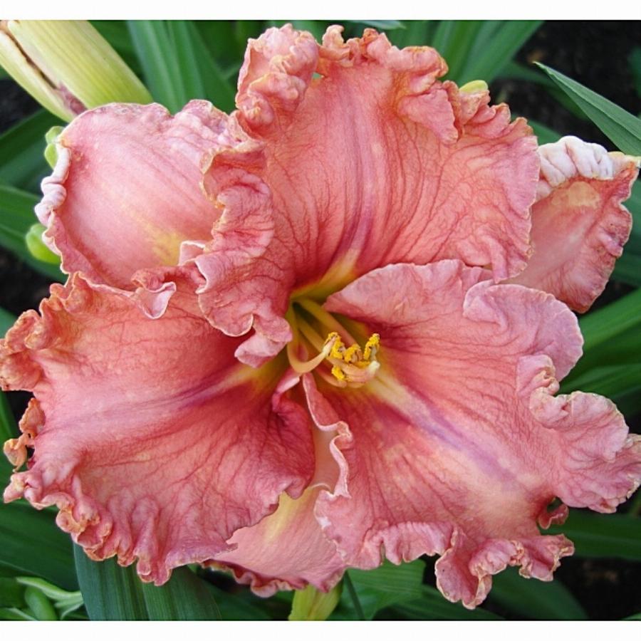 Высота растения.-0,75 м. Диаметр цветка-16 см. Крупный розово-лососевый цветок с темным красно-розовым глазком в центре. Дополнительным украшением служат лавандовые прожилки на лепестках, и широкая, гофрированная, оборочка. Цветонос имеет 4 ветви с 30 бутонами.