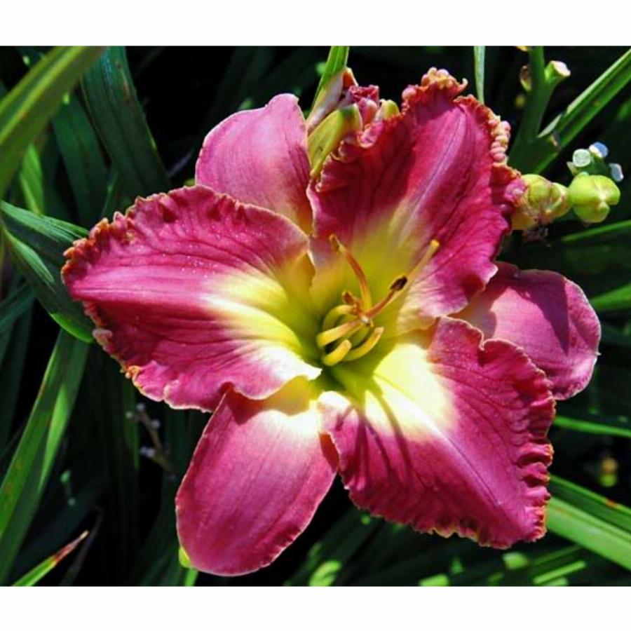 Лилейник гибридный. Цветок рубиновый с белыми пятном и кантом и жёлтым горлом, гофрированный. Высота 65-70см.