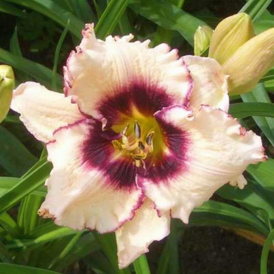 Сорт 1997 года. Абсолютно феноменальный, очень красивый сорт! Многолетнее корневищное растение до 65 см высотой, с прямыми дуговидно изогнутыми, постоянно зелеными листьями. Цветки крупные, до 15 см в диаметре, цвета слоновой кости, с большим четким черно-пурпурным глазом и пузырчато-гофрированным окаймлением, собраны в раскидистые соцветия. Раннесреднего срока цветения, повторно цветущий. Цветение обильное. Предпочитает освещенные места и проницаемые, влажные, плодородные почвы. Засухоустойчив. Зимостоек. Отзывчив на удобрения, особенно в момент заложения цветочных бутонов. Долговечен, без пересадки растет 5-6, до 10 лет. Размножают делением корневища, в апреле-мае или в сентябре. Стабильно декоративен. Партнеры: многие многолетники, в том числе хоста, астильба, бадан, папоротники, ирисы, анемона гибридная. Используют в группах, рабатках, миксбордерах, у водоемов, а также в одиночных посадках.