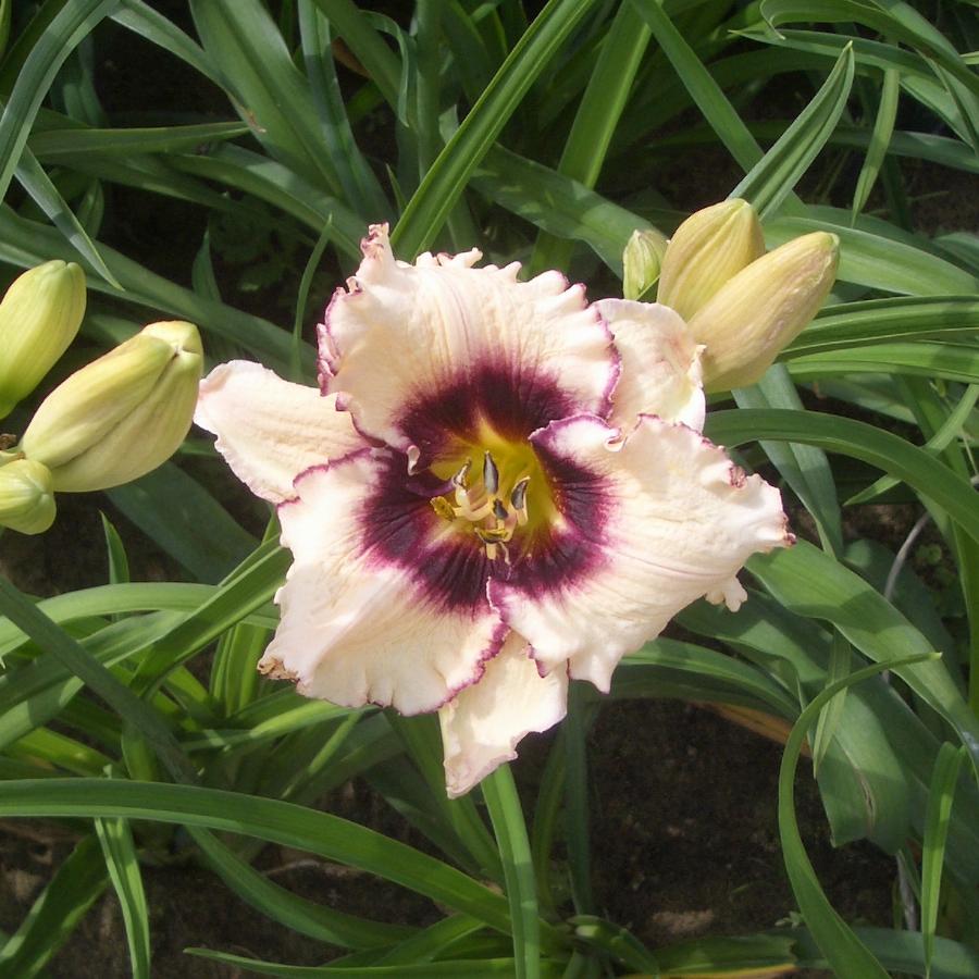 Сорт 1997 года. Абсолютно феноменальный, очень красивый сорт! Многолетнее корневищное растение до 65 см высотой, с прямыми дуговидно изогнутыми, постоянно зелеными листьями. Цветки крупные, до 15 см в диаметре, цвета слоновой кости, с большим четким черно-пурпурным глазом и пузырчато-гофрированным окаймлением, собраны в раскидистые соцветия. Раннесреднего срока цветения, повторно цветущий. Цветение обильное. Предпочитает освещенные места и проницаемые, влажные, плодородные почвы. Засухоустойчив. Зимостоек. Отзывчив на удобрения, особенно в момент заложения цветочных бутонов. Долговечен, без пересадки растет 5-6, до 10 лет. Размножают делением корневища, в апреле-мае или в сентябре. Стабильно декоративен. Партнеры: многие многолетники, в том числе хоста, астильба, бадан, папоротники, ирисы, анемона гибридная. Используют в группах, рабатках, миксбордерах, у водоемов, а также в одиночных посадках.