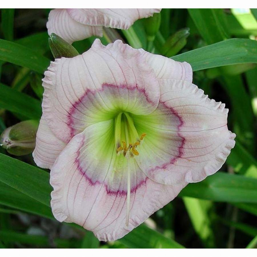Высота растения 45см,кремовый с лавандовым глазком и зеленым горлом, гофрированный. Цветение июнь-июль.