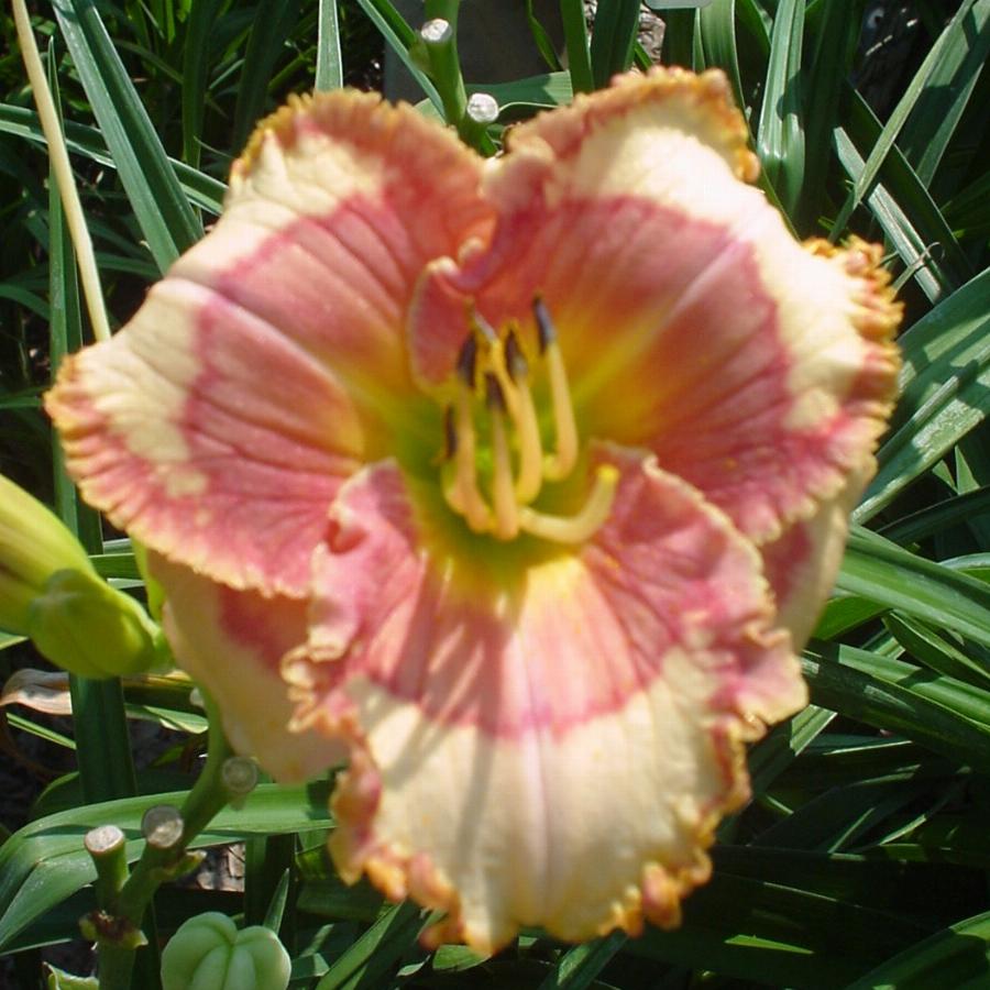 Розовый с розовым глазом и золотым краем, зеленое горло.